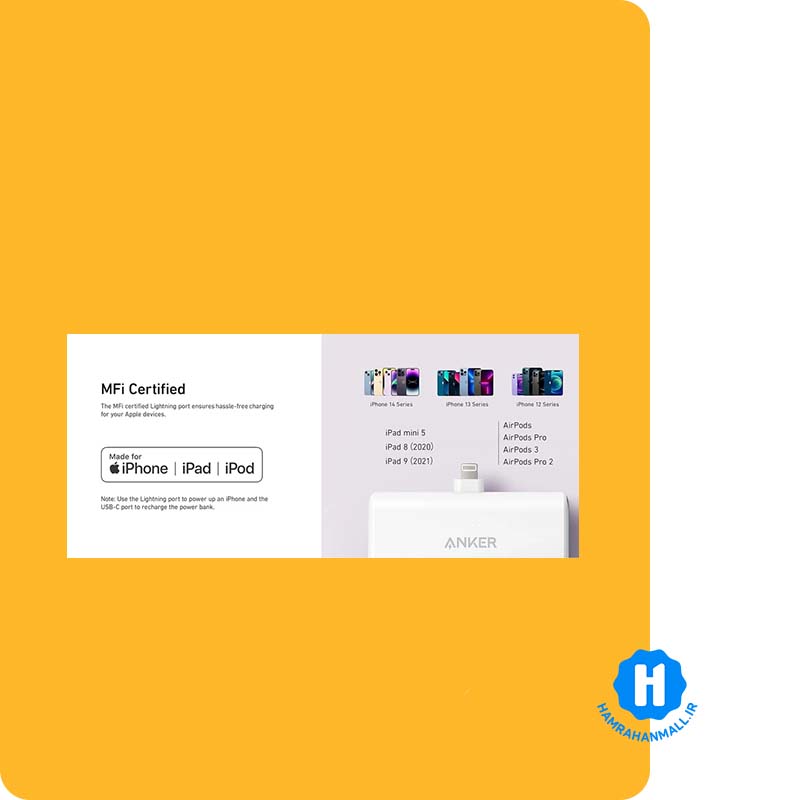 پاوربانک 5000 میلی آمپر سوکت لایتنینگ انکر مدل Anker A1645H11 دارای MFI می باشد که MFI به معنی تاییده اپل است که سازگار با تمامی ایفون هایی است درگاه لایتنینگ دارند.