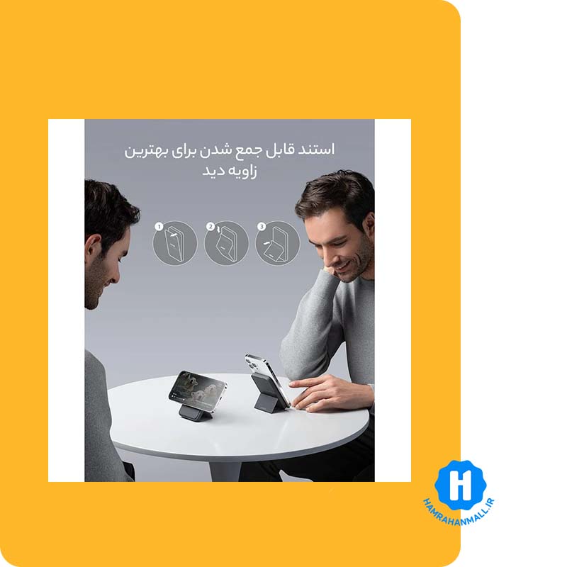 دارای یک پایه تاشو داخلی همه کاره است و با ایجاد زاویه دید بهتر، گوشی های همراه شما را نظیر آیفون 12 و 13 را به حالت عمودی نگه می دارند. صفحه شارژ مگنتی این محصول از یک آهنربای فوق العاده قوی برخودار است و به دلیل قابلیت مغناطیسی، تلفن همراه را در جای خود ثابت نگه می دارد و می توانید از شارژ کارآمد آن اطمینان پیدا کنید. سازنده در عین مقاومت با طراحی شیک و باریک این محصول با ضخامت 12.8 میلی متر، سعی بر آن داشته است تا این محصول فوق العاده را به عنوان یک پاوربانک قابل حمل نیز برای کاربر به ارمغان آورد. بر روی بدنه پاوربانک یک دکمه پاور تعبیه شده است که با استفاده از آن علاوه بر فعال و غیر فعال نمودن کارایی محصول، می توانید از میزان باتری پاوربانک با توجه به چراغ های نشانگر LED اطلاع حاصل کنید.