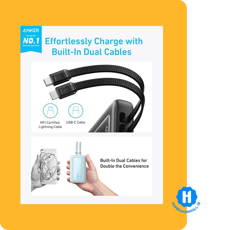 یکی از برجستهترین ویژگیهای این مدل، وجود دو کابل داخلی بافتهشده است: یک کابل USB-C و یک کابل لایتنینگ دارای گواهی MFi (سازگار با اپل). این کابلها با دوام بیش از 10,000 بار خم شدن، نیاز به حمل کابل جداگانه را از بین میبرند.
