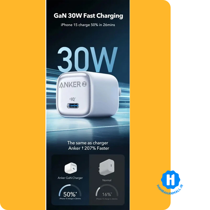 سرعت شارژ مثالزدنی: طبق گفته Anker، این شارژر میتواند آیفون ۱۵ را تنها در ۲۶ دقیقه تا ۵۰% شارژ کند، که سه برابر سریعتر از شارژرهای ۵ واتی استاندارد اپل است. این سرعت برای کاربران پرمشغله که زمان کمی برای شارژ دستگاه خود دارند، بسیار مفید است.