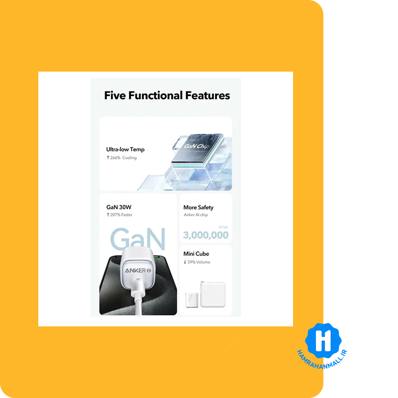 نوآوری در مدیریت حرارت: یکی از نگرانیهای همیشگی در شارژرهای پرقدرت و کوچک، تولید گرما است. Anker با بهرهگیری از “Ice-Chip Technology” در این مدل، توانسته است این چالش را به خوبی مدیریت کند. این فناوری باعث میشود که شارژر حتی در اوج فعالیت، دمای خود را 11 درجه سانتیگراد پایینتر از استانداردهای ملی حفظ کند.