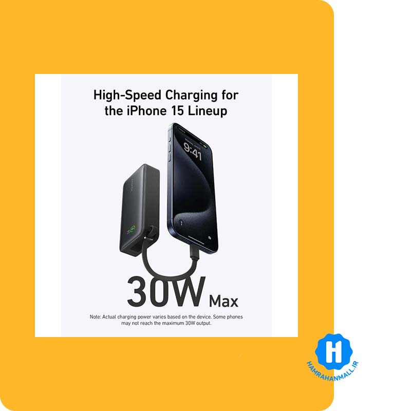 پاوربانک Anker Nano با ظرفیت 10,000 میلیآمپر ساعت و توان 30 وات (مدل A1259H11) یک شارژر قابل حمل با طراحی فشرده و کابل USB-C داخلی است.