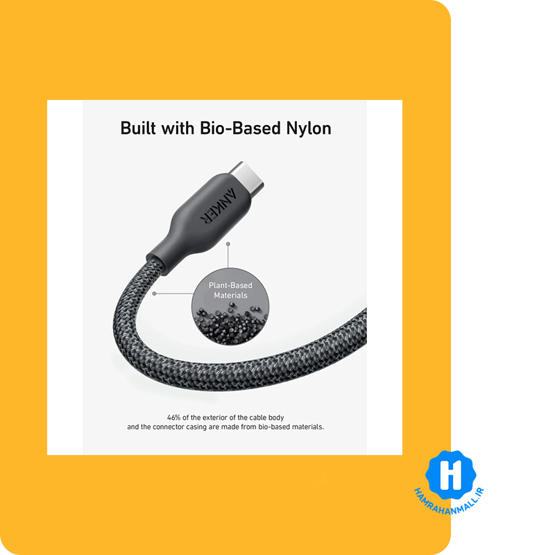 ساخته شده با نایلون Bio-Based: 46٪ از قسمت بیرونی بدنه کابل و پوشش رابط از نایلون زیستی ساخته شده است. استفاده از نایلون های زیستی در کابل ها به ما این امکان را می دهد که پلاستیک های مبتنی بر نفت مانند TPE را کاهش دهیم.