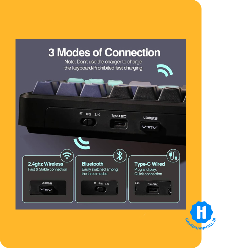 اتصال سهحالته: Bluetooth 5.0، دانگل 2.4GHz، USB-C — سوییچ بین 3 دستگاه فقط با Fn + Q/W/E