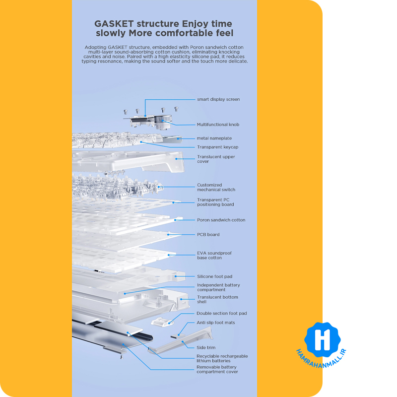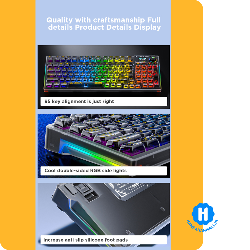این مدل با اتصال سهحالته (سیمی، وایرلس ۲.4GHz و بلوتوث)، ساختار Gasket Mount، نمایشگر هوشمند و سوئیچ White نرم و سریع، تعادل کمنظیری بین گیمینگ، تایپ حرفهای و استفاده روزمره ایجاد میکند 🎯