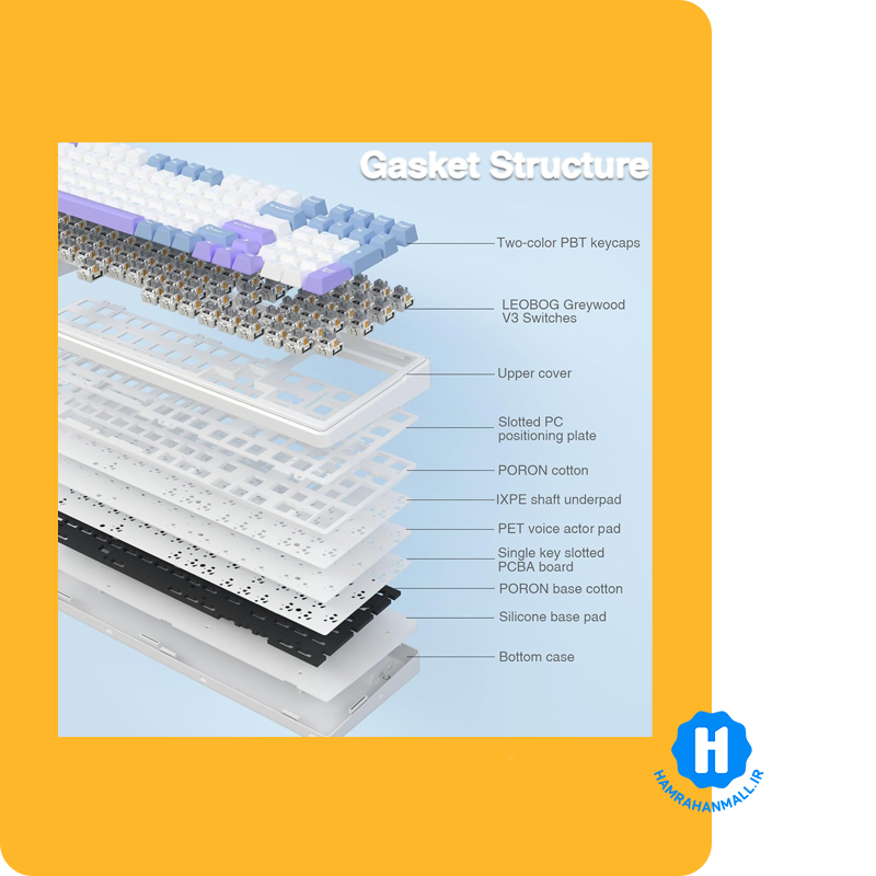 ساختار Gasket Mount با چندین لایه جذب صدا و لرزش، صدای تایپ رو نرمتر و حس ضربهزدن به کلیدها رو دلپذیرتر میکنه.
