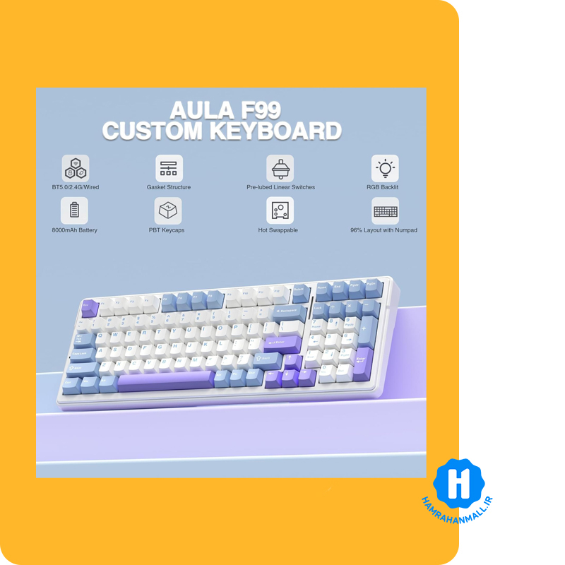 کیبورد گیمینگ سیم دار ، وایرلس و بلوتوثی آئولا مدل AULA F99 (رنگ کلید سفید / آبی /بنفش) سوییچ GRAY