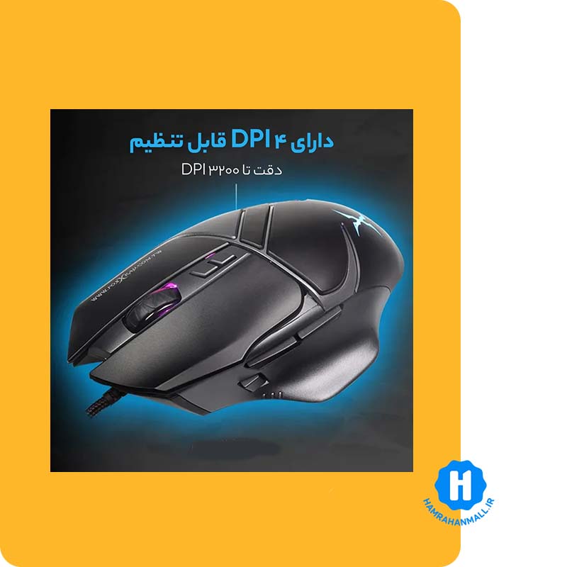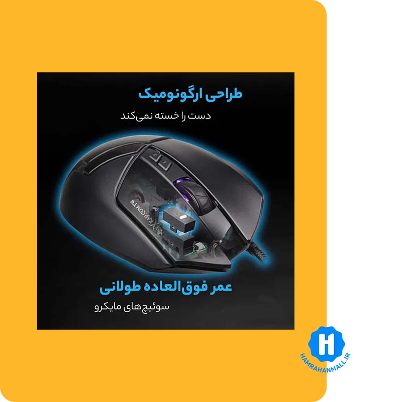 دارای وزن اضافی داخل موس برای پایداری بیشتر / دارای میکرو سوئیچ با طول عمر استفاده 5 میلیون بار / ویژگی ظاهری ارگونومیک