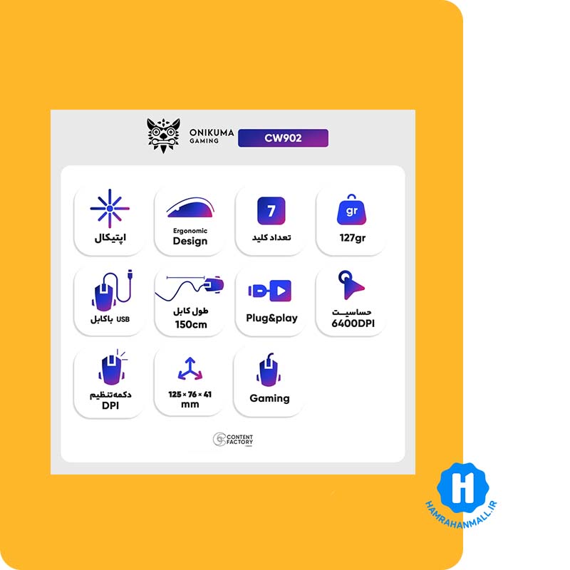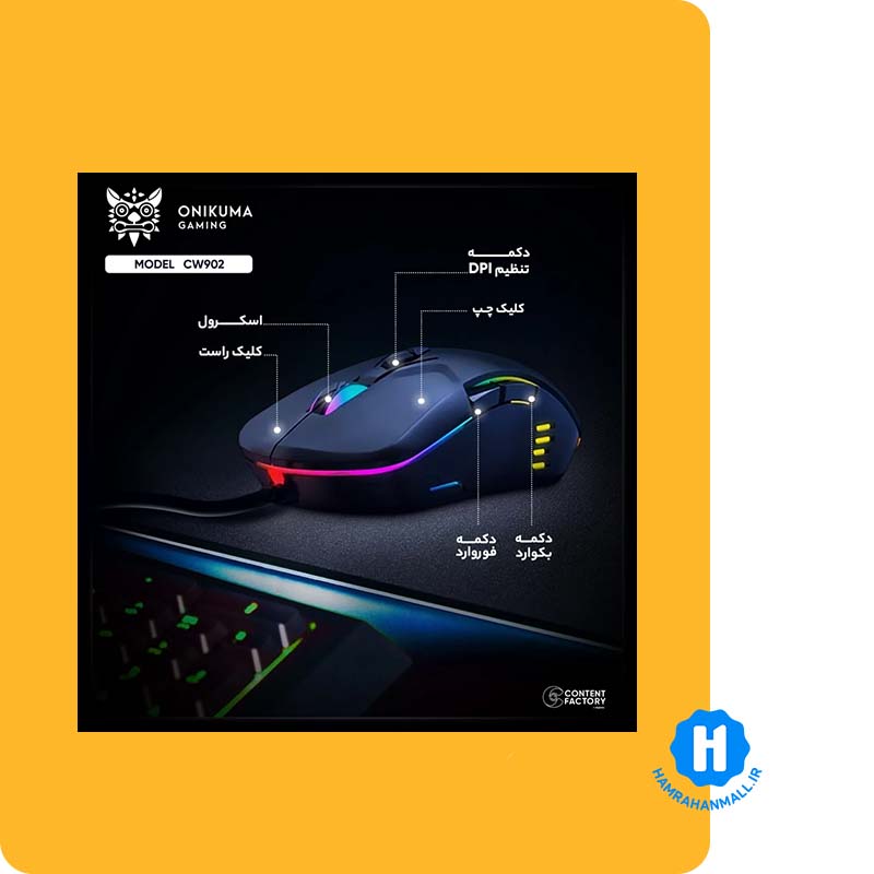 برند اونیکوما فعالیت خود را در زمینه ساخت انواع ماوس از سال 2016 میلادی آغاز کرد. پرفروشترین محصولات این برند نظیر ماوس مخصوص بازی اونیکوما مدل CW902 توانستهاند سهم بالایی از فروش بازار جهانی را سهم خود کنند. مدل CW902 یکی از کاربردیترین و زیباترین محصولات این برند محسوب شده که از قابلیت RGB برخوردار است. DPI این ماوس قابلیت تنظیم در 800، 1600 ،2400، 3200، 4800 و 6400 را دارا بوده که برای شرایط مختلف مانند گیمینگ و فعالیتهای روزمره کاربرد دارند. ماوس سیمی CW902 از طراحی ارگونومیک برخوردار بوده که میتواند مانع از خستگی کاربران در استفادههای طولانیمدت شود. همچنین RGB این ماوس در رنگهای مختلف قابل تنظیم بوده و به این محصول ظاهری حرفهای و مدرن بخشیده است. این ماوس گیمینگ از شرکت اونیکوما به 7 دکمه قابل برنامهریزی مجهز بوده و کاربر را قادر میسازد تا آنها را برای شرایط مختلف سفارشیسازی کند. حسگر اپتیکال این ماوس از محدوده دقت بالا برخوردار بوده و به شما این امکان را میدهد که بر روی انواع سطوح از آن بهآسانی استفاده کنید.