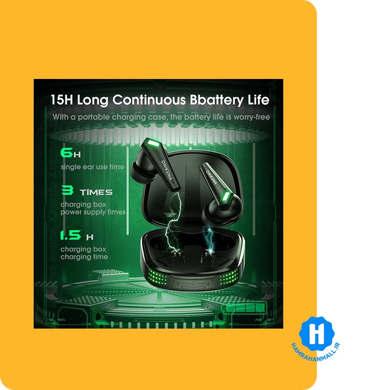 هدفون گیمینگ بیسیم ONIKUMA T308 TWS با هدفون حذف نویز میکروفون، کنترل لمسی استریو عمر باتری طولانی: 15 ساعت از کل عمر باتری، همچنان از منبع تغذیه استفاده کنید. هنگامی که حالت بازی خاموش است، یک بار شارژ می تواند حدود 6 ساعت خدمات ارائه دهد که در ارتباط با محفظه شارژ دوام بیشتری دارد.