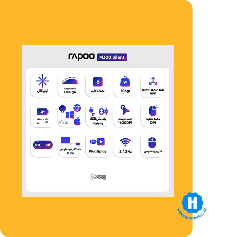 در دنیای قطعات کامپیوتری، ماوسهای بیسیم از جمله ابزارهای اساسی برای افرادی هستند که به دنبال کارایی و انعطاف بیشتر هستند. ماوس بیسیم رپو مدل M300 Silent یکی از این محصولات کارآمد است که با مشخصات فنی برتر و قابلیتهای گسترده، به عنوان یک انتخاب عالی در بازار ماوسهای بیسیم مطرح شده است. وزن این ماوس 106 گرم و ابعاد آن 103.91×65.43×37.29 میلیمتر است که با توجه به اندازه کوچک و وزن سبکاش، به کاربر امکان استفاده راحت و بدون هیچگونه خستگی را میدهد. این محصول با برخورداری از 6 کلید عملی و کاربردی، گزینهای همه جانبه به شمار میرود. این ماوس با حسگر اپتیکال با دقت 800 تا 1600 امکان استفاده بر روی سطوح مختلف ازجمله چوبی، شیشهای و سنگی را برای کاربران فراهم میکند. همچنین ماوس بیسیم رپو دارای یک باتری قلمی آلکالاین AA که بهوسیله آن کار میکند. از جمله قابلیتهای برجسته آن میتوان به کلید روشن و خاموش، نسخهی بلوتوث 4، قابلیت کلیکهای بدون صدا (Silent Click) و قابلیت تنظیم DPI اشاره کرد. این ماوس بهصورت بیسیم از طریق دانگل Nano USB Receiver یا بلوتوث 3.0 و 4.0 به دستگاه متصل میشود و این ویژگی باعث میشود که کاربران بتوانند آن را به انواع مختلف دستگاهها متصل کنند.